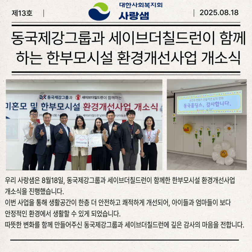 8월18일 동국제강그룹과 세이브더칠드런이 함께한 한부모시설환경개선사업 개소식을 진행했습니다.이번사업을 통해 생활공간이 한층 더 안전하고 쾌적하게 개선되어아이들과 엄마들이 보다 안정적인 환경에서 생활할 수 있게 되었습니다.따뜻한 변화를 함께만들어주신 동국제강그룹과 세이브더칠드런에 깊은 감사를 드립니다.