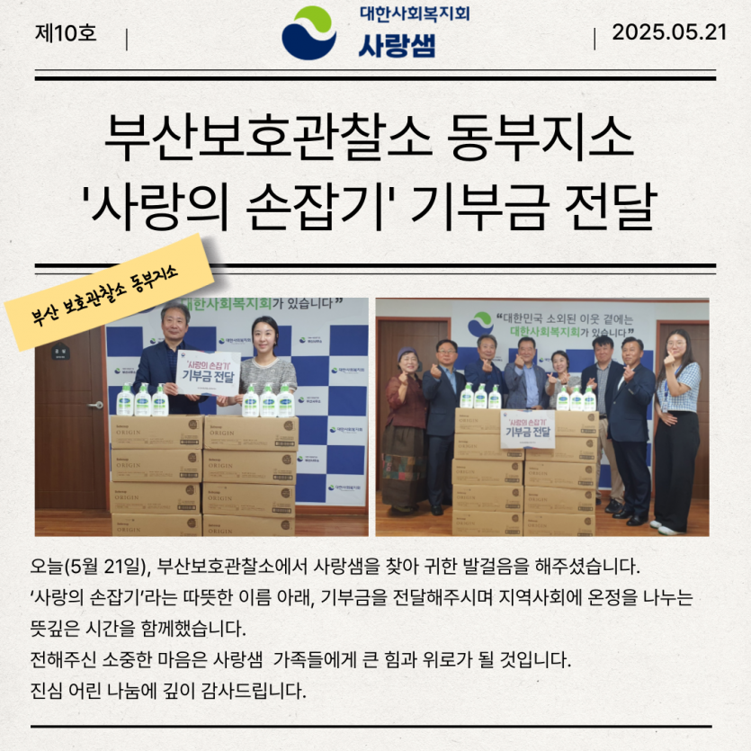 [나눔] 부산보호관찰소 기부 감사합니다. 사랑샘관리자 0 735 2025.05.21 15:20 ♥사랑의 손잡기, 따뜻한 나눔의 시간♥ 오늘 사랑샘에 반가운 손님이 찾아오셨습니다. 부산보호관찰소에서 ‘사랑의 손잡기’라는 이름으로 기부금을 전달해주셨습니다. 작은 손길 하나가 누군가에겐 큰 힘이 되듯, 전해주신 소중한 마음은 사랑샘 가족들에게 따뜻한 위로와 희망이 되었습니다. 함께해주신 부산보호관찰소에 진심으로 감사드립니다.