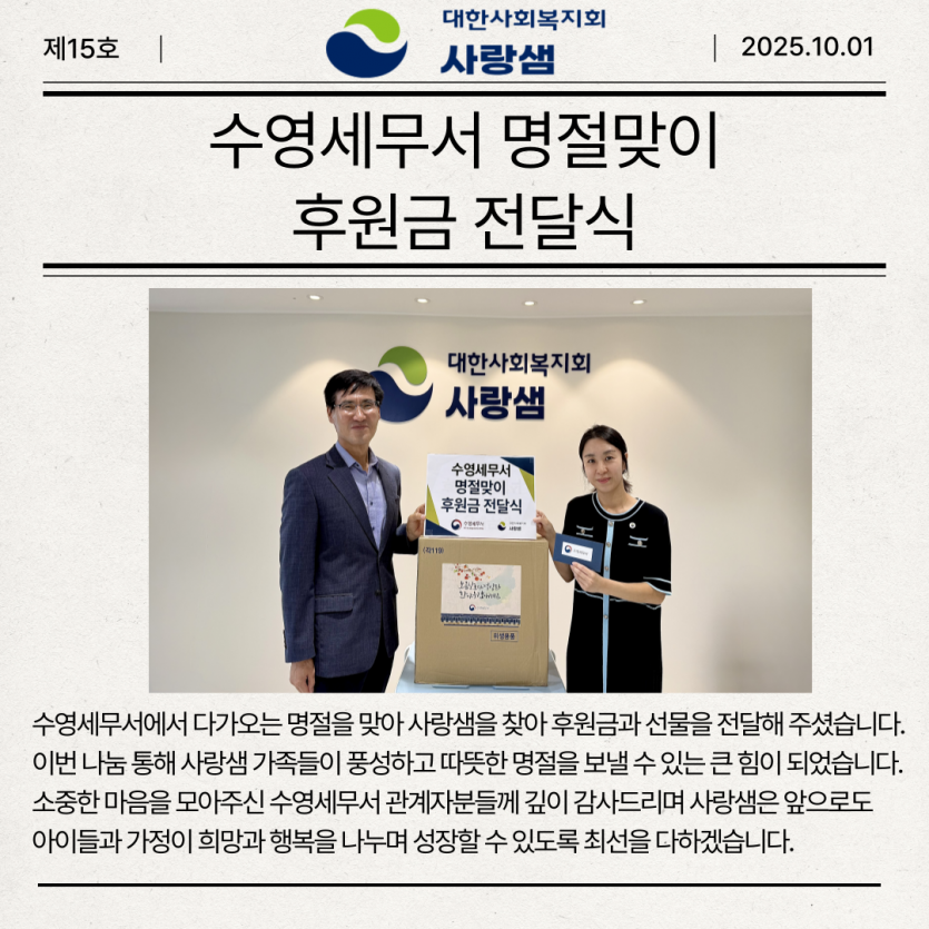 [나눔] 수영세무서 명절맞이 기부 사랑샘관리자 0 519 2025.10.02 13:15 수영세무서에서 명절을 맞아 사랑샘 가족들에게 후원금과 선물을 전달해 주셨습니다. 따뜻한 마음 덕분에 사랑샘가족들은 더욱 풍성한 명절을 보낼 수 있게 되었습니다. 감사합니다^^
