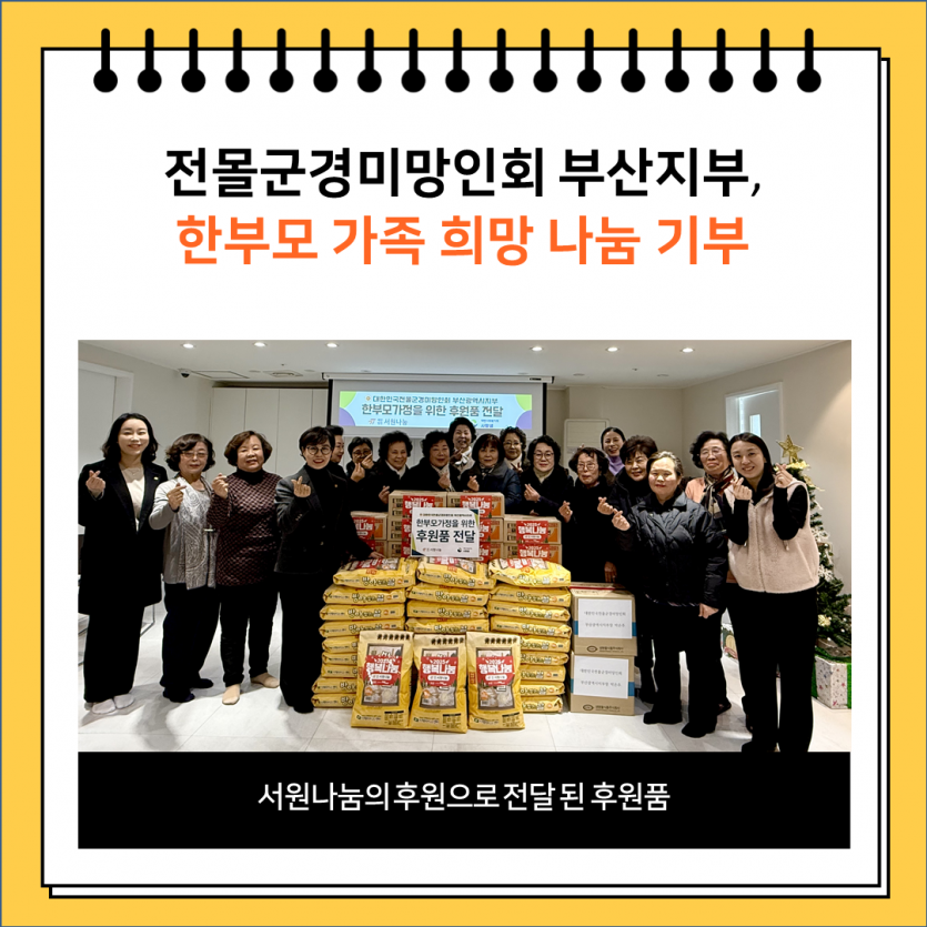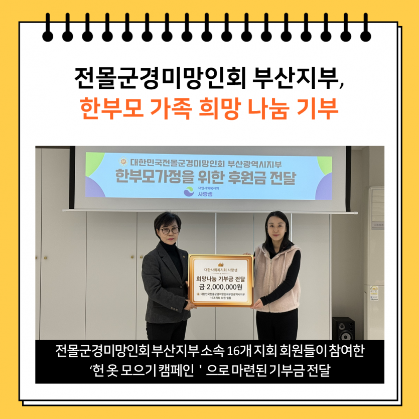 이번 기부금은 부산지부 소속 16개 지회 지회장님들과 회원들이 마음을 모아 진행한 ‘헌 옷 모으기 캠페인’을 통해 마련되어 그 의미가 더욱 깊습니다.
